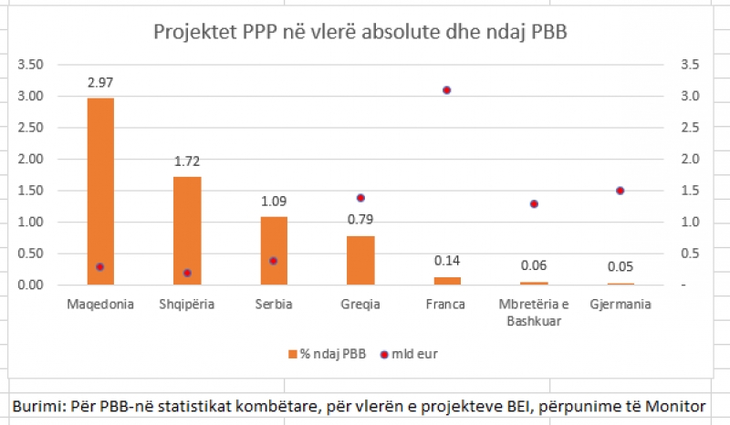 Ndërsa sipas të dhënave Kombëtare nga Ministria e Financave dhe Ekonomisë vlera e totale e kontratave në fuqi me PPP aktualisht është 203 miliardë lekë ose rreth 1.5 miliardë euro, duke zënë më shumë se rreth 12 për qind te PBB-së. Monitor