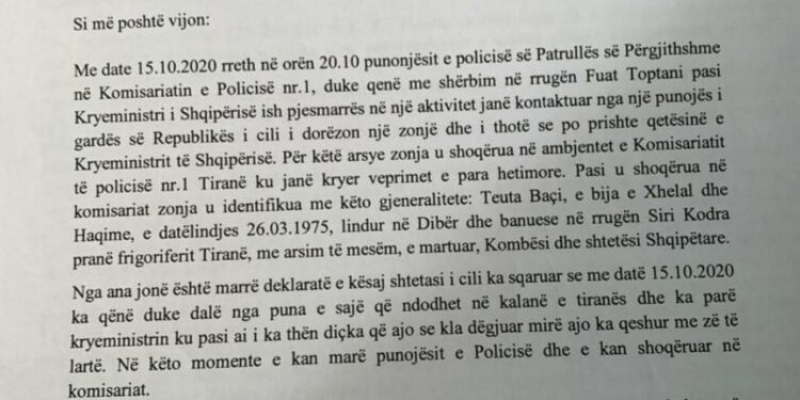 Në dokument thuhet se një grua nga Dibra është arrestuar dhe shoqëruar në polici, vetëm sepse ka qeshur me zë të lartë, gjatë kohës që në rrugë kalonte kryeministri Edi Rama. Sipas dokumentit, ngjarja ka ndodhur më 15 tetor 2020 në rrugën “Fuat Toptani” në Tiranë.