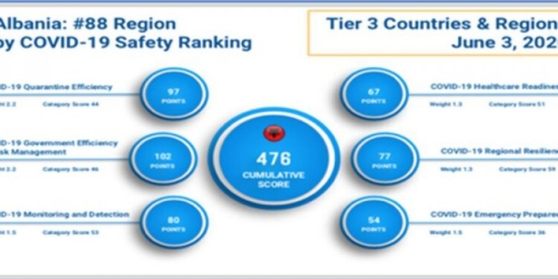 Shqipëria përsa i përket “sigurisë nga pendemia” ka mundur të grumbullojë në total 476 pikë dhe është në vendin e 41-të në Europë, në vendin e tretë nga fundi nga 43 vënde europiane. Vendi që e ka menaxhuar më mirë këtë pandemi është Zvicra, e cila me 752 pikë për “sigurinë” gjëndet në vendin e parë. Para Shqipërisë në këtë klasfikim janë të gjithë vëndet e Ballkanit, Rumania në vendin e 30 me 531 pikë, Serbia në vendin e 29 me 532 pikë, Mali i Zi në vendin e 22 me 548 pikë, Kroacia në vendin e 18 me 556 pikë, Greqia në vendin e 16 me 560 pikë dhe Sllovenia në vendin e 15 me 564 pikë. Shqipëria ka mundur të kalojë vetëm Maqedoninë e Veriut që është në vendin e fundit me 431 pikë (shiko edhe ikonogafikun).
