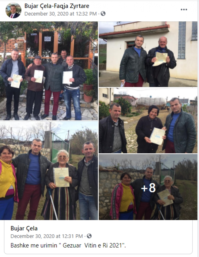 “Në Komisionin Qendror të Zgjedhjeve, janë raportuar dy denocime në ndërfaqen e “Aktiviteteve të Ndaluara”, në rubrikën “Kallëzo”, për veprimtaritë e deputetit të PS, Qarku Fier, z. Bujar Çela, i cili ka publikuar në llogarinë e tij personale në Facebook disa foto me qytetarë të ndryshëm duke shpërndarë leje legalizimi të shtëpive të tyre në Njësinë Administrative Hyzgjokaj.