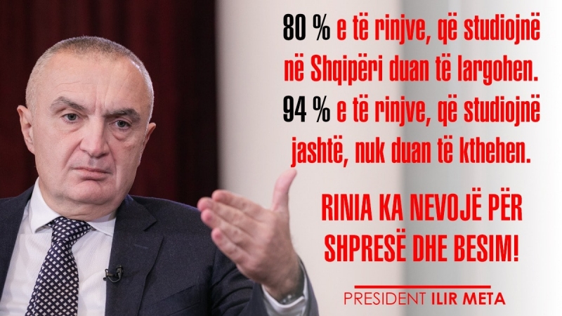Presidenti Ilir Meta, pas mbledhjes së një paneli me profesorë dhe ekspertë për temën e shpopullimit ditën e enjte, këtë të premte përmes një postimi në facebook, thekson se 80 % e të rinjve që studiojnë në vend duan që të largohen. Thirrja e kreut të shtetit, është që rinia ka nevojë për shpresë dhe besim.