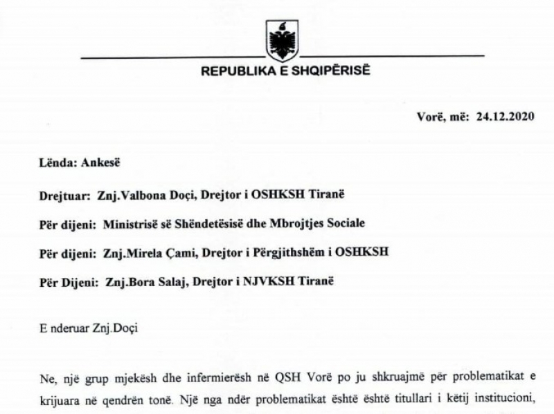 Koordinatori i LSI, Vojo Bregu ka publikuar një letër të mjekëve dhe infermierëve të Vorës për Ministren e Shëndetësisë.