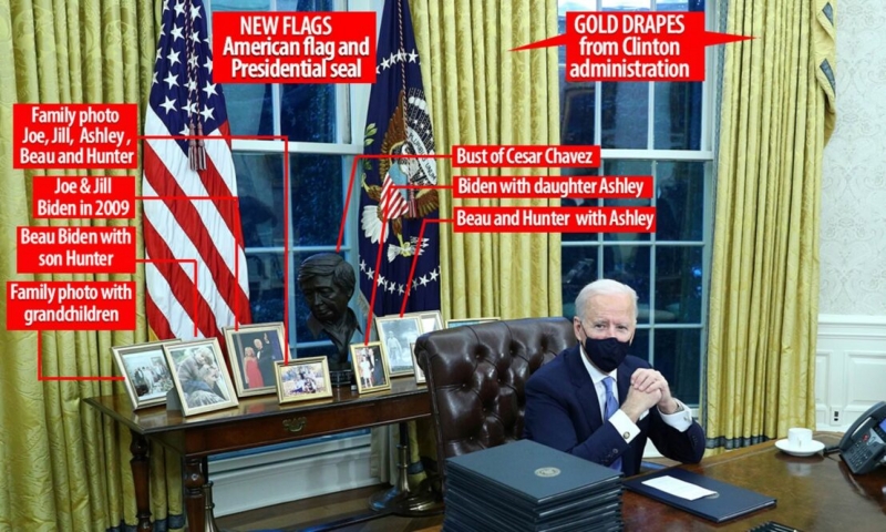 Menjëherë pas inagurimit dhe betimit, Joe Biden ka nisur detyrën si Preisdenti i 46-të i SHBA-ve. Zyra Ovale e presidentit brenda pak orësh u shndërrua dukshëm për të pasqyruar shijen dhe politikën e mbajtësit të zyrës. Njerëzit janë të interesuar çfarë marrëveshjesh bëhen në atë zyrë dhe cilat politika njoftohen. Por, me çdo pëllëmbë të hapësirës së ekspozuar, presidentët e SH.B.A.-së, familjet e tyre dhe stafi i tyre gjithashtu zgjedhin me përpikmëri se cilat pjesë të artit do të vendosen, çfarë mobiljesh dhe madje çfarë çokollatash vendosen në rafte.