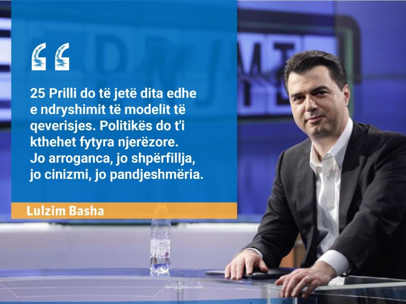 Lulzim Basha: Edi Rama e ka marrë damkën dhe do marri dhe votën e shqiptarëve, ndëshkimin e shqiptarëve, votën kundër më datë 25 Prill për të gjitha premtimet e pa mbajtura, për të gjitha atë që ka bërë në këto 8 vite që ka përkeqësuar jetën e tyre në çdo aspekt dhe që na ka renditur në vendin, në delen e zezë të Ballkanit e jo më të Europës. Prandaj e gjithë vëmendja ime është tek e nesërmja, Edi Rama është e djeshmja, e gjithë energjia ime është tek e nesërmja dhe unë e di shumë mirë se 25 Prilli nuk është thjesht dita kur shqiptarët do votojnë kundër Edi Ramës por kur do të presin me padurim që jo vetëm mos të zhgënjehen nga Lulzim Basha, nga Partia Demokratike, nga koalicioni ynë por që unë të bëj realitet pritshmëritë që më takojnë, jo thjesht për këtë që jam por për atë që përfaqësoj, një brez I ri I brumosur me parime të tjera dhe me standarde të tjera dhe shqiptarët kanë të drejtë ti kenë këto pritshmëri ndaj meje dhe unë do bëj gjithçka që mos t’i zhgënjej nga familja më e varfër deri tek shtresa e mesme dhe tek akademikët.