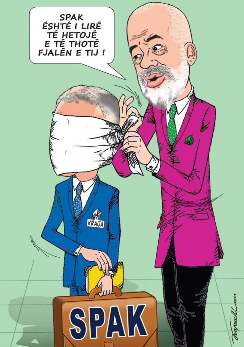 Pikërisht këtë përpjekje të kryeministrit Rama për të intimiduar dhe mbyllur sytë e SPAK ndaj skandaleve me përmasa të tilla, ka pasqyruar në karikaturat e fundit, botuar në Mapo, mjeshtri Bujar Kapexhiu