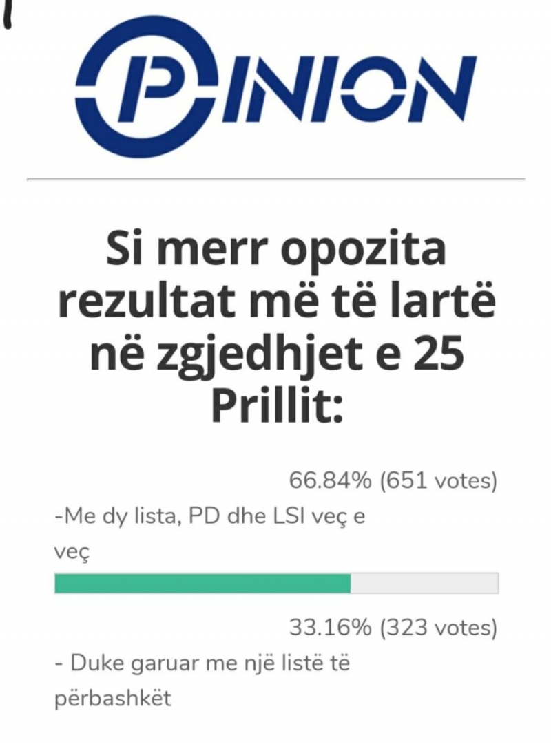 Sondazhi në Opinion ishte mbrëmë “Si merr Opozita rezultatin më të lartë në zgjedhje?”. Pas dy orë votime online tregoi se vendimi i LSI dhe PD për dy koalicione opozitare në zgjedhje mbetet vendimi që maksimalizon votat kundër kryeministrit Rama. Pas sondazhit rezultoi se 66.84 % janë pro këtij vendimi