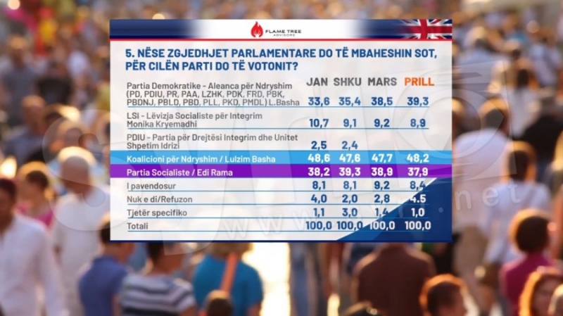 Në sondazhin e bërë nga ‘Flame Tree Advisors’, në muajin prill PD ka parakaluar PS-në, duke dalë si parti e parë.