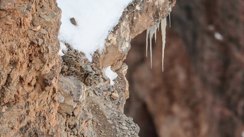 Nëse e sheh këtë pamje, fotografia ngjan sikur është një hapësirë shkëmbore e mbuluar me borë. Por diku mes shkëmbinjve, është një leopard, i cili është i fshehur shumë mirë.