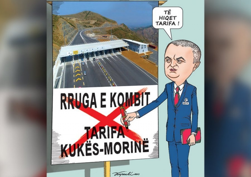 Pikërisht këtë qëndrim të presidentit të Shqipërisë “e ka shfrytëzuar”, mjeshtri I karikaturës Bujar Kapexhiu për punën e tij të radhës, botuar te Mapo. Në këtë pamflet-karikaturë, shfaqet presidenti duke i hequr kryq “doganës” në Rrugën e kombit ku koncensionari i Ramës vendos taksa të larta për qytetarët dhe biznesin kosovarë.